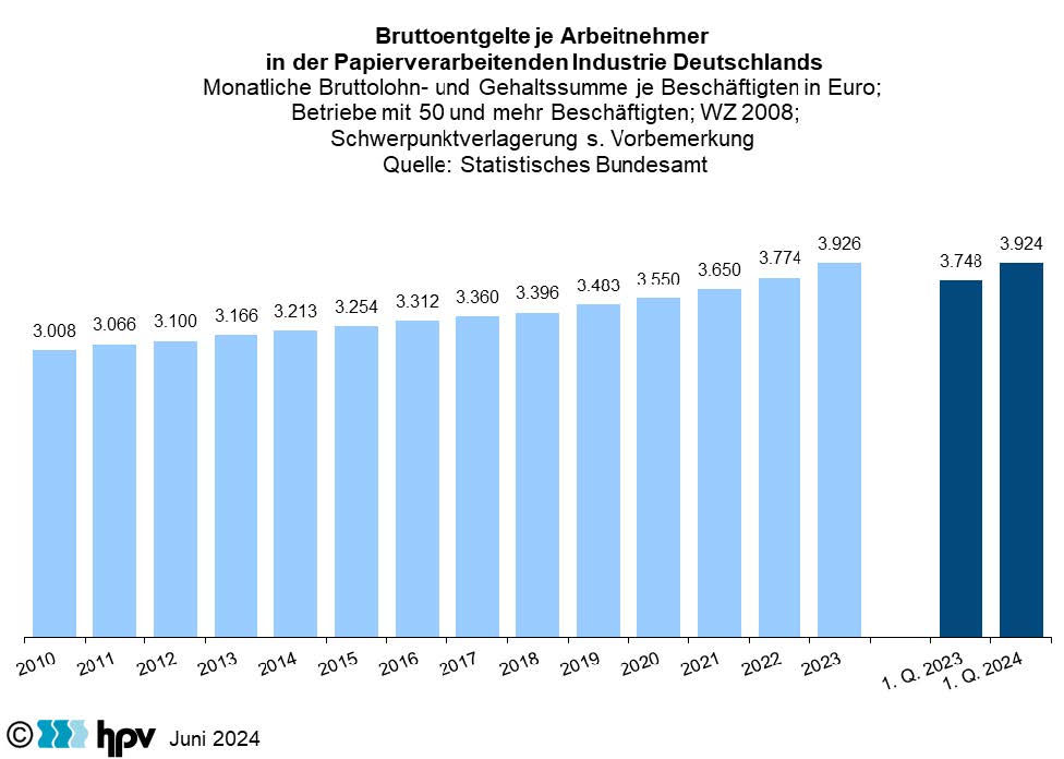 - Das monatliche Bruttoentgelt je Beschäftigten belief sich in der Papierverarbeitenden Industrie im ersten Quartal 2024 auf durchschnittlich 3.924 Euro. Gegenüber dem Vor-jahreszeitraum bedeutet dies einen Anstieg von rund 176 Euro oder 4,7 Prozent. Je Stunde gerechnet betrug der Anstieg sogar 5,3 Prozent.