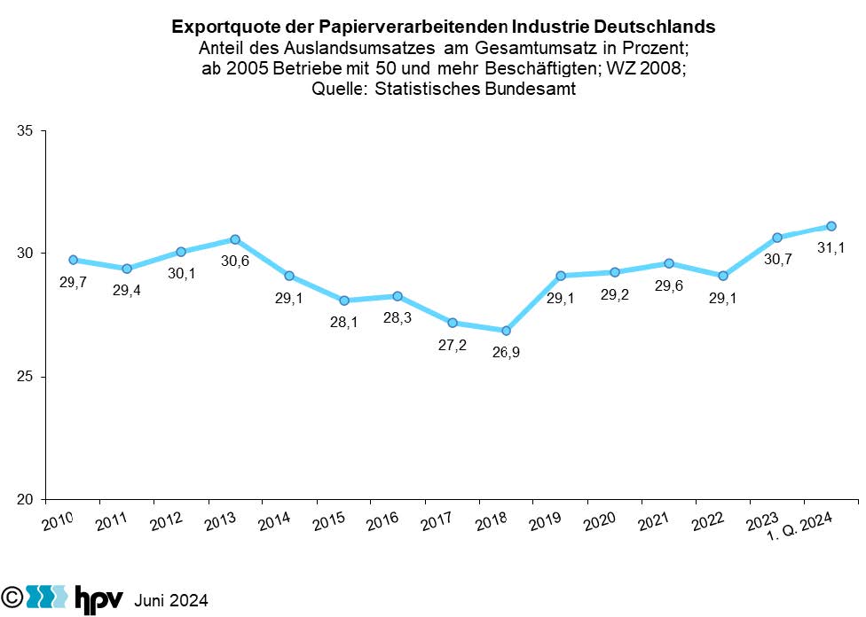 - In relativer Betrachtung haben die Auslandsmärkte für die deutsche Papierverarbeitende Industrie im ersten Quartal 2024 mit einer Exportquote von 31,1 Prozent gegenüber dem Vorjahr deutlich an Bedeutung gewonnen. Damit wurde der höchste Wert im Untersuchungszeitraum ab 2010 erreicht. Gegenüber dem ersten Quartal 2023 ist die Exportquote um einen Prozentpunkt gestiegen.