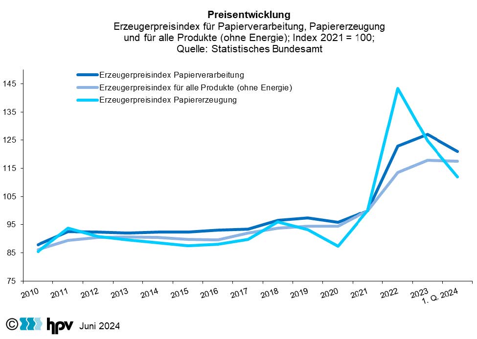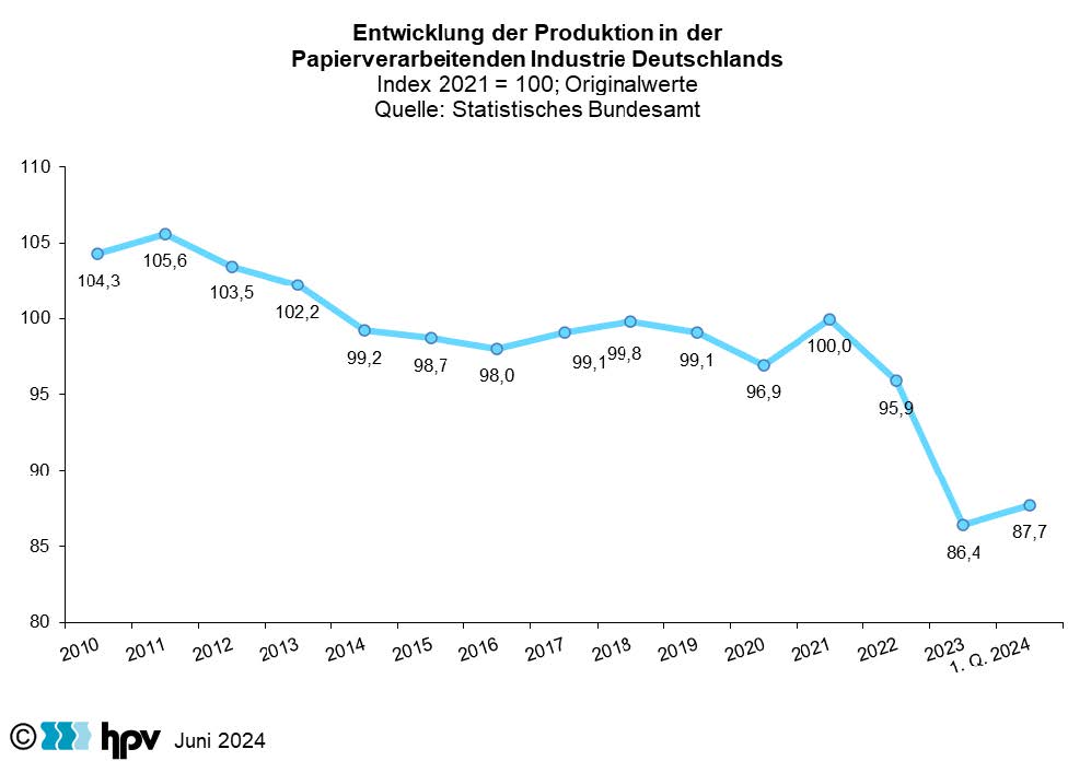 - Der Produktionsindex wurde Anfang 2024 auf das neue Basisjahr 2021 umgestellt. Damit ist gleichzeitig eine Neugewichtung der Unterbranchen der Papierverarbeiten-den Industrie verbunden, sodass es auch zu kleinen Revisionen in den Veränderungs-raten kommen kann. Alle Werte wurden auf Grundlage des neuen Basisjahres vom Statistischen Bundesamt bis 1991 zurückgerechnet.