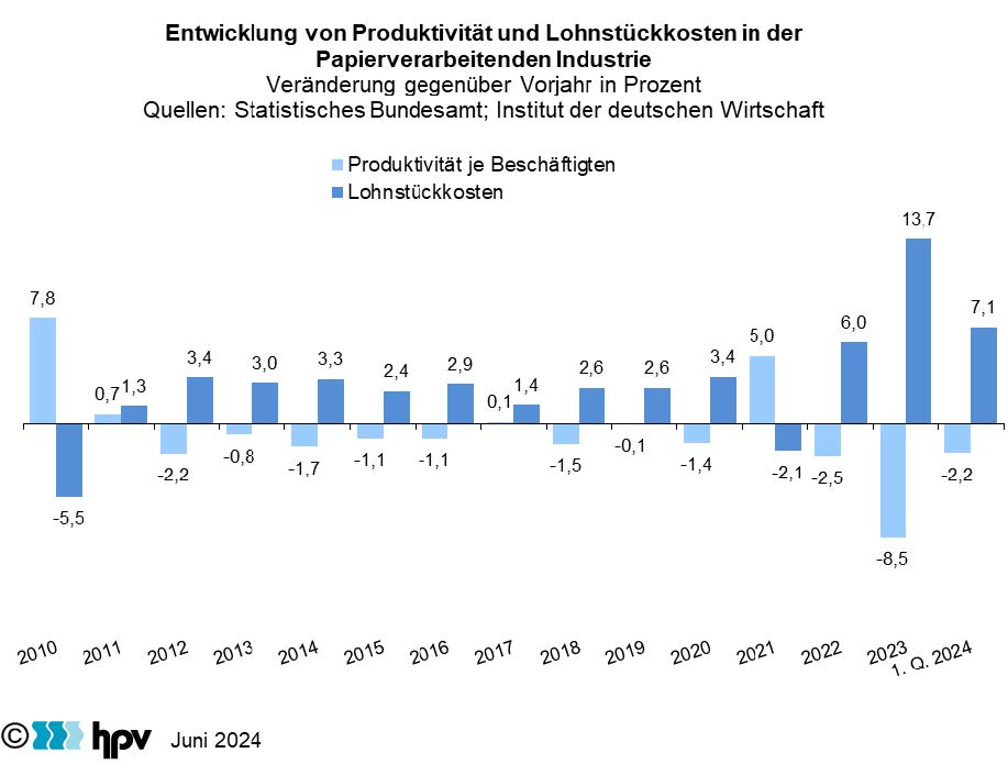 - Nach Berechnungen der Deutschen Bundesbank ergab sich für die Papier-verarbeitende Industrie kalenderjährlich und je Stunde gerechnet im Jahr 2023 eine Kostenbelastung von 5 Prozent. Das war etwas mehr als im Durchschnitt aller Branchen. Der gesamtwirtschaftliche Durchschnitt lag laut Bundesbank im letzten Jahr bei 4 Prozent.