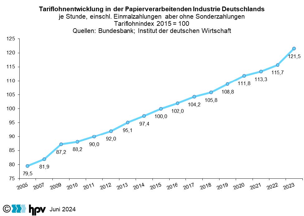 - Im langfristigen Vergleich fällt die aktuelle Bruttolohnerhöhung der Papierverarbeiten-den Industrie damit überdurchschnittlich aus. Denn zwischen 2010 und 2023 stiegen die Bruttolöhne je Beschäftigten im Jahresdurchschnitt lediglich um 2,1 Prozent pro Jahr. Eine Beschleunigung der Lohndynamik ist bereits seit mehreren Jahren festzustellen: Im Jahr 2021 legten die Monatsentgelte bereits um 2,8 Prozent zu. Im Jahr 2022 waren es dann 3,4 Prozent und 2023 schon 4,0 Prozent.