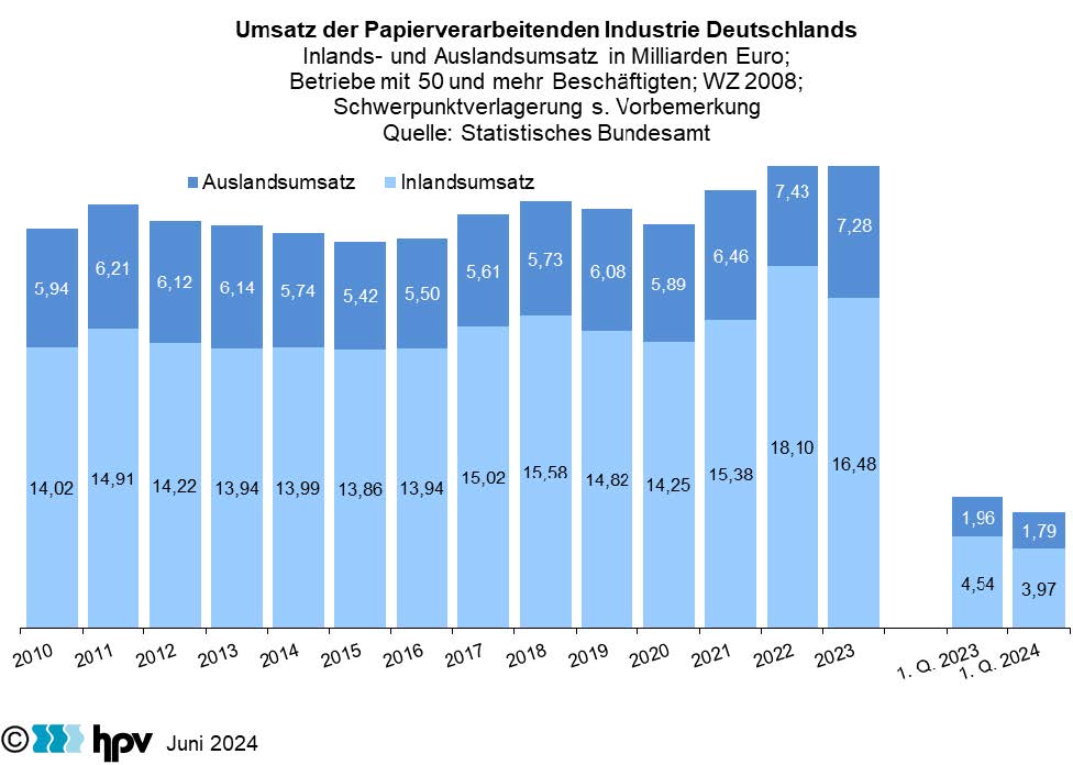 - Im ersten Quartal 2024 lag der Gesamtumsatz in der Papierverarbeitenden Industrie bei 5,76 Milliarden Euro. Gegenüber dem Umsatz des gleichen Vorjahreszeitraums, der bei 6,50 Milliarden Euro lag, ergab sich ein Minus von 0,74 Milliarden Euro. Das entspricht einem Rückgang um 11,4 Prozent. Dabei belief sich der Inlandsumsatz auf 3,97 Milliarden Euro und der Auslandsumsatz auf 1,79 Milliarden Euro. Damit lagen sowohl der Inlands- als auch der Auslandsumsatz unter ihren jeweiligen Vorjahresniveaus. Der Inlandsumsatz ging mit 12,7 Prozent etwas stärker als der Auslandsumsatz zurück. Dort lag das Minus bei 8,4 Prozent. Der Anteil der Inlandsumsätze am Gesamtumsatz ging weiter zurück. Im Jahr 2022 lag die Quote bei knapp 71 Prozent, im Jahr 2023 waren es 69,3 und im ersten Quartal 2024 dann 68,9 Prozent.