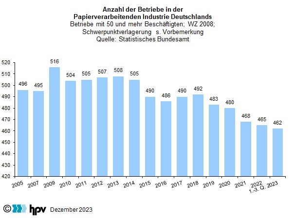 - In der Papierverarbeitenden Industrie gab es im Jahr 2022 insgesamt 465 Betriebe mit mindestens 50 Beschäftigten. Von Januar bis September 2023 waren es drei Betriebe weniger.