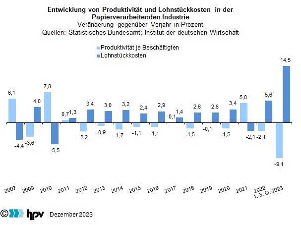 - In den ersten drei Quartalen des Jahres 2023 zusammengenommen stiegen die Lohnstückkosten gegenüber dem entsprechenden Vorjahreszeitraum um 14,5 Prozent. Damit wurde der Rekordwert des Untersuchungszeitraums aus dem Jahr 2022, der bei 5,6 Prozent lag, pulverisiert. Ursächlich hierfür sind der starke Rückgang der Produktion bei gleichzeitig hohen Lohnanstiegen.
