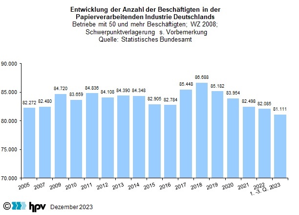 - Die Anzahl der Beschäftigten in der Papierverarbeitenden Industrie ist seit dem Höchststand von 2018 kontinuierlich rückläufig. Waren im Durchschnitt des Jahres 2021 noch 82.498 Personen beschäftigt, sank der Durchschnittswert im Jahr 2022 auf 82.085 und in den ersten drei Quartalen des Jahres 2023 auf 81.111 Personen.