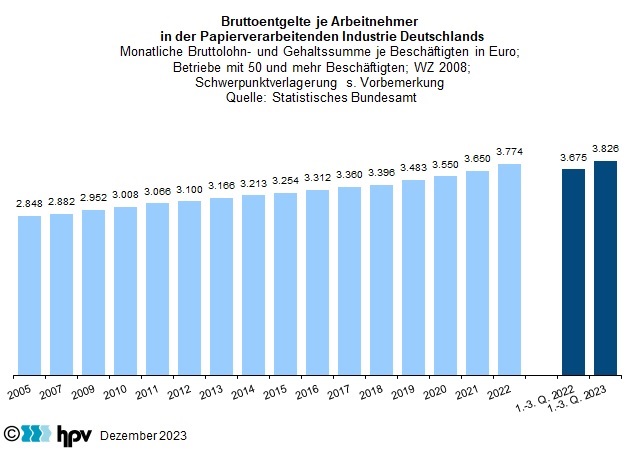 - Das monatliche Bruttoentgelt je Beschäftigten belief sich in der Papierverarbeitenden Industrie in den ersten drei Quartalen des Jahres 2023 auf durchschnittlich 3.826 Euro. Gegenüber dem entsprechenden Vorjahreszeitraum bedeutet dies einen Anstieg von rund 151 Euro oder 4,1 Prozent.