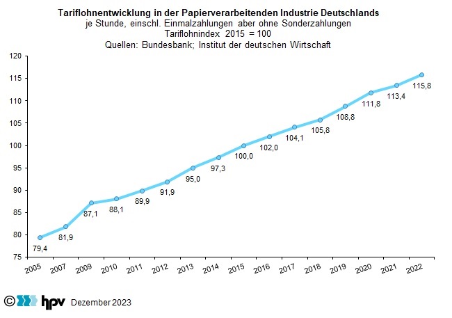 - Nach Berechnungen der Deutschen Bundesbank ergab sich für die Papierverarbeitende Industrie kalenderjährlich und je Stunde gerechnet im Jahr 2022 eine Kostenbelastung von 2,12 Prozent. Im gesamtwirtschaftlichen Durchschnitt lag die Belastung bei 2,64 Prozent.