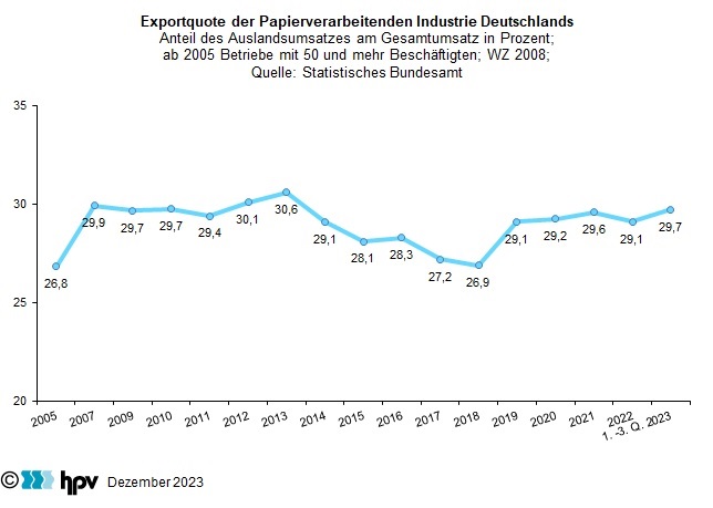 - In relativer Betrachtung haben die Auslandsmärkte für die deutsche Papier-verarbeitende Industrie in den ersten drei Quartalen des Jahres 2023 mit einer Exportquote von 29,7 Prozent gegenüber dem Vorjahr leicht an Bedeutung gewonnen. Gleichwohl hat sich die Exportquote nicht deutlich von den Werten der Vorjahre abgesetzt. Denn seit 2019 pendelt die Exportquote der Papierverarbeitenden Industrie zwischen 29,1 und 29,7 Prozent.