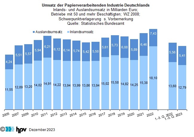 - In den ersten drei Quartalen 2023 lag der Gesamtumsatz in der Papierverarbeitenden Industrie bei 18,19 Milliarden Euro. Gegenüber dem Umsatz des gleichen Vorjahreszeitraums, der bei 19,16 Milliarden Euro lag, ergab sich ein Minus von 0,97 Milliarden Euro. Das entspricht einem Rückgang von 5,1 Prozent. Dabei belief sich der Inlandsumsatz auf 12,8 Milliarden Euro und der Auslandsumsatz auf 5,4 Milliarden Euro. Damit lagen sowohl der Inlands- als auch der Auslandsumsatz leicht unter ihren jeweiligen Vorjahresniveaus. Der Anteil der Inlandsumsätze am Gesamtumsatz lag in den ersten drei Quartalen 2023 bei 70,3 Prozent. Im entsprechenden Vorjahreszeitraum lag die Quote mit 71,0 Prozent etwas höher.
