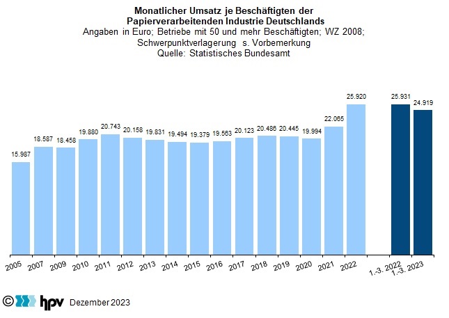 Aufgrund von Schwerpunktverlagerungen wurden ab Januar 2023 erneut Betriebe innerhalb der Wirtschaftszweige (Abteilung, Gruppe, Klasse der WZ 2008) neu zugeordnet. Nennenswerte Abweichungen von mehr als 2 Prozent bei den Beschäftigten (minus 2,6 Prozent) oder beim Umsatz (minus 0,9 Prozent) gab es allein in der WZ-Gruppe 17.22 (Herstellung von Haushalts-, Hygiene- und Toilettenartikeln aus Zellstoff, Papier und Pappe). Insgesamt bleiben die Auswirkungen der neuen Zuordnung überschaubar. Dennoch ergeben sich bei den Daten für Betriebe in den Wirtschaftszweigen gewisse Veränderungen, die bei einem durchgehenden Zeitvergleich zu berücksichtigen sind. Dies gilt vor allem für den intertemporalen Vergleich der Beschäftigung und des Umsatzes.