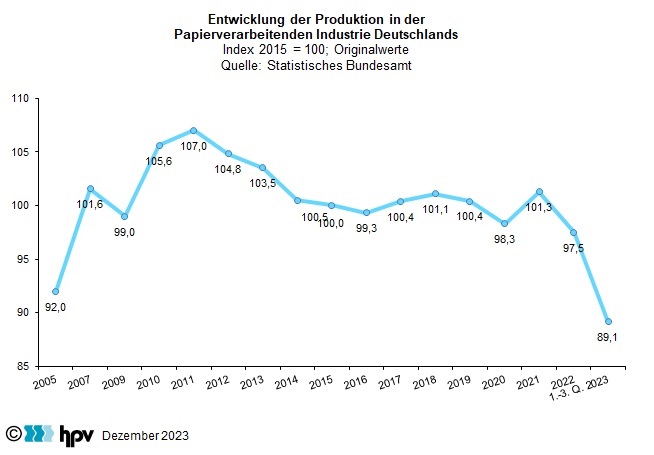 Im Jahr 2023 war die wirtschaftliche Entwicklung in der Papierverarbeitenden Industrie bislang von einer Branchenrezession geprägt. Der Produktionsindex lag im dritten Quartal kalender- und saisonbereinigt nur noch bei 86,8 (2015=100). Der Erzeugerpreisindex der Branche blieb mit einem Durchschnittswert von 138,9