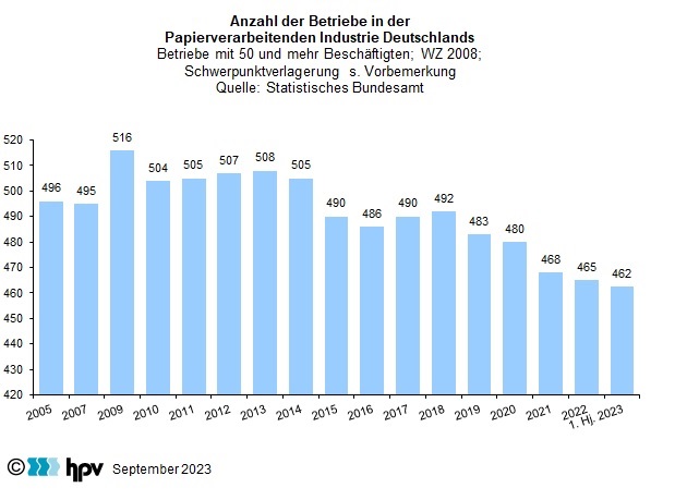 - In der Papierverarbeitenden Industrie gab es im Jahr 2022 insgesamt 465 Betriebe mit mindestens 50 Beschäftigten. Im ersten Quartal 2023 waren es drei Betriebe weniger.