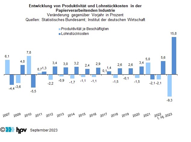 Im ersten Halbjahr 2023 war die wirtschaftliche Entwicklung in der Papierverarbeitenden Industrie von einer Branchenrezession geprägt. Der Produktionsindex lag im zweiten Quartal kalender- und saisonbereinigt nur noch bei 87,7 (2015=100). Der Erzeugerpreisindex der Branche verharrte mit einem Durchschnittswert von 140,8 für das 1. Halbjahr 2023 (1. Halbjahr 2022: 127,1) auf hohem Niveau. Damit wurde die Umsatzentwicklung weiter durch die Preise getrieben. Der Umsatz lag im ersten Halbjahr 2023 etwas unter dem Niveau desselben Vorjahreszeitraums. Da die Produktivität je Beschäftigten im ersten Halbjahr 2023 um 9,3 Prozent schrumpfte, stiegen die Lohnstückkosten kräftig an. Im Vergleich zum ersten Halbjahr 2022 ergibt sich ein Plus von 15,8 Prozent.