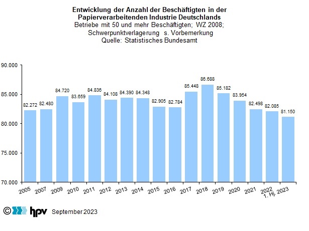 - Die Anzahl der Beschäftigten in der Papierverarbeitenden Industrie ist seit dem Höchststand von 2018 kontinuierlich rückläufig. Waren im Durchschnitt des Jahres 2021 noch 82.498 Personen beschäftigt, waren es im Jahr 2022 mit 82.085 etwas weniger. Im ersten Halbjahr 2023 belief sich der Durchschnittswert auf 81.150 Personen.