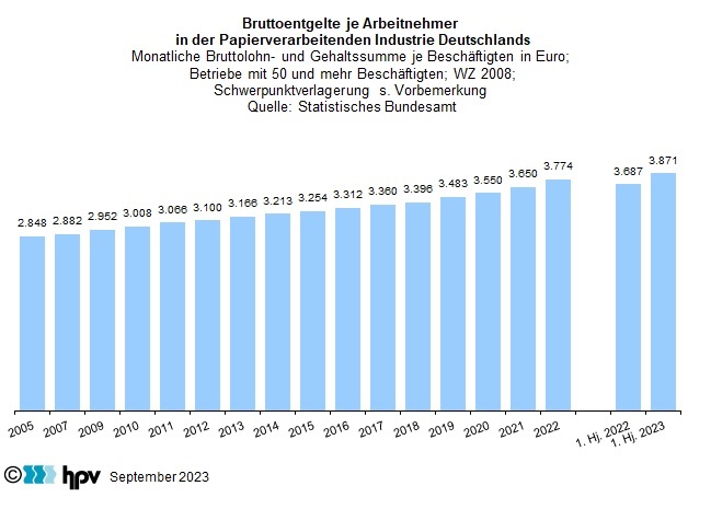 - Das monatliche Bruttoentgelt je Beschäftigten belief sich in der Papierverarbeitenden Industrie im ersten Halbjahr 2023 auf 3.871 Euro. Gegenüber dem entsprechenden Vorjahresquartal bedeutet dies einen Anstieg von rund 184 Euro.