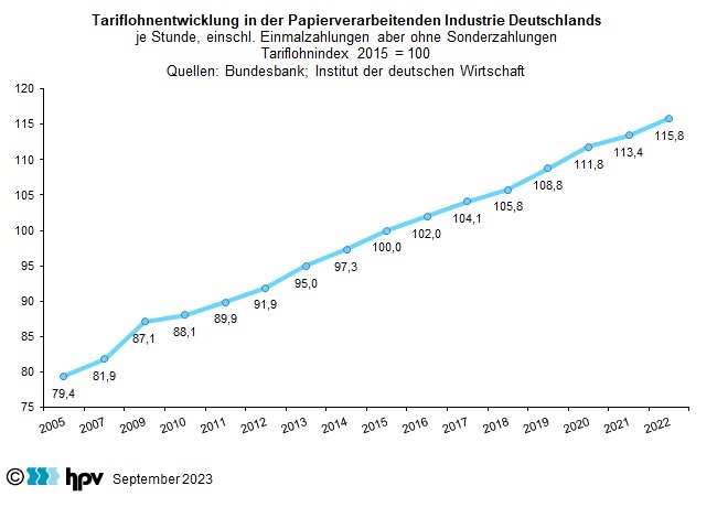 - Nach Berechnungen der Deutschen Bundesbank ergab sich für die Papierverarbeitende Industrie kalenderjährlich und je Stunde gerechnet im Jahr 2022 eine Kostenbelastung von 2,12 Prozent. Im gesamtwirtschaftlichen Durchschnitt lag die Belastung bei 2,64 Prozent.