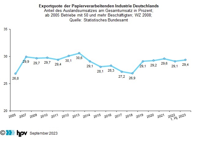- In relativer Betrachtung haben die Auslandsmärkte für die deutsche Papierverarbeitende Industrie im ersten Halbjahr 2023 mit einer Exportquote von 29,4 Prozent gegenüber dem Vorjahr ihre Bedeutung gehalten – seit 2019 pendelt die Exportquote der Papierverarbeitenden Industrie um die 29 Prozent.