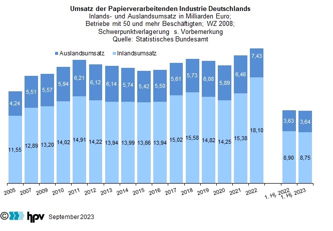 - Im ersten Halbjahr 2023 lag der Gesamtumsatz in der Papierverarbeitenden Industrie bei 12,39 Milliarden Euro. Gegenüber dem Umsatz des gleichen Vorjahreszeitraums, der bei 12,53 Milliarden Euro lag, ergab sich ein Minus von 0,13 Milliarden Euro. Das entspricht einem Rückgang von knapp 1,1 Prozent. Dabei belief sich der Inlandsumsatz auf knapp 8,8 Milliarden Euro und der Auslandsumsatz auf gut 3,6 Milliarden Euro. Damit lag der Inlandsumsatz leicht unter und der Auslandsumsatz leicht über ihrem jeweiligen Vorjahresniveau. Der Anteil der Inlandsumsätze am Gesamtumsatz lag im ersten Halbjahr 2023 bei 71 Prozent. Diese Quote ergab sich auch im ersten Halbjahr 2022.