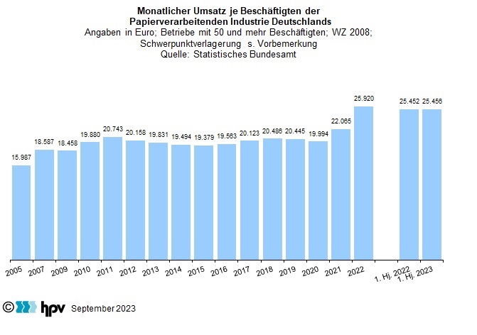 - Der Umsatz je Beschäftigten änderte sich in der deutschen Papierverarbeitenden Industrie im ersten Halbjahr 2023 gegenüber dem gleichen Vorjahreszeitraum kaum. Während der Pro-Kopf-Umsatz im ersten Halbjahr 2022 bei 25.452 Euro lag, waren es im ersten Halbjahr des laufenden Jahres 25.456 Euro. Damit blieb die Pro-Kopf-Umsatzentwicklung unverändert, während die nominale Umsatzentwicklung leicht rückläufig war (Seite 6).