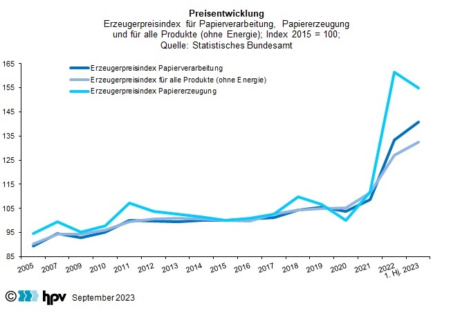 - In der Papiererzeugenden Industrie ist der Erzeugerpreisindex bereits seit Oktober 2022 – der Wert betrug damals 173,9 – gesunken und lag im Juni 2023 noch bei 145,5 und somit fast 16 Prozent niedriger. Der Durchschnitt des ersten Halbjahrs 2023 betrug 155,0. Daraus ergibt sich ein Rückgang von 4 Prozent im Vergleich zum Jahresdurchschnitt 2022. Dies ist allerdings vor dem Hintergrund des außerordentlich hohen Preisanstiegs im Jahr 2022 zu sehen. Gegenüber 2021 stiegen die Preise um 44 Prozent.
